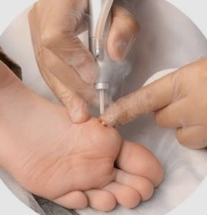 Kovettumien poisto mekaanisesti veitsellä ja pora työskentelyllä. Syylien ja kynsien hoito.